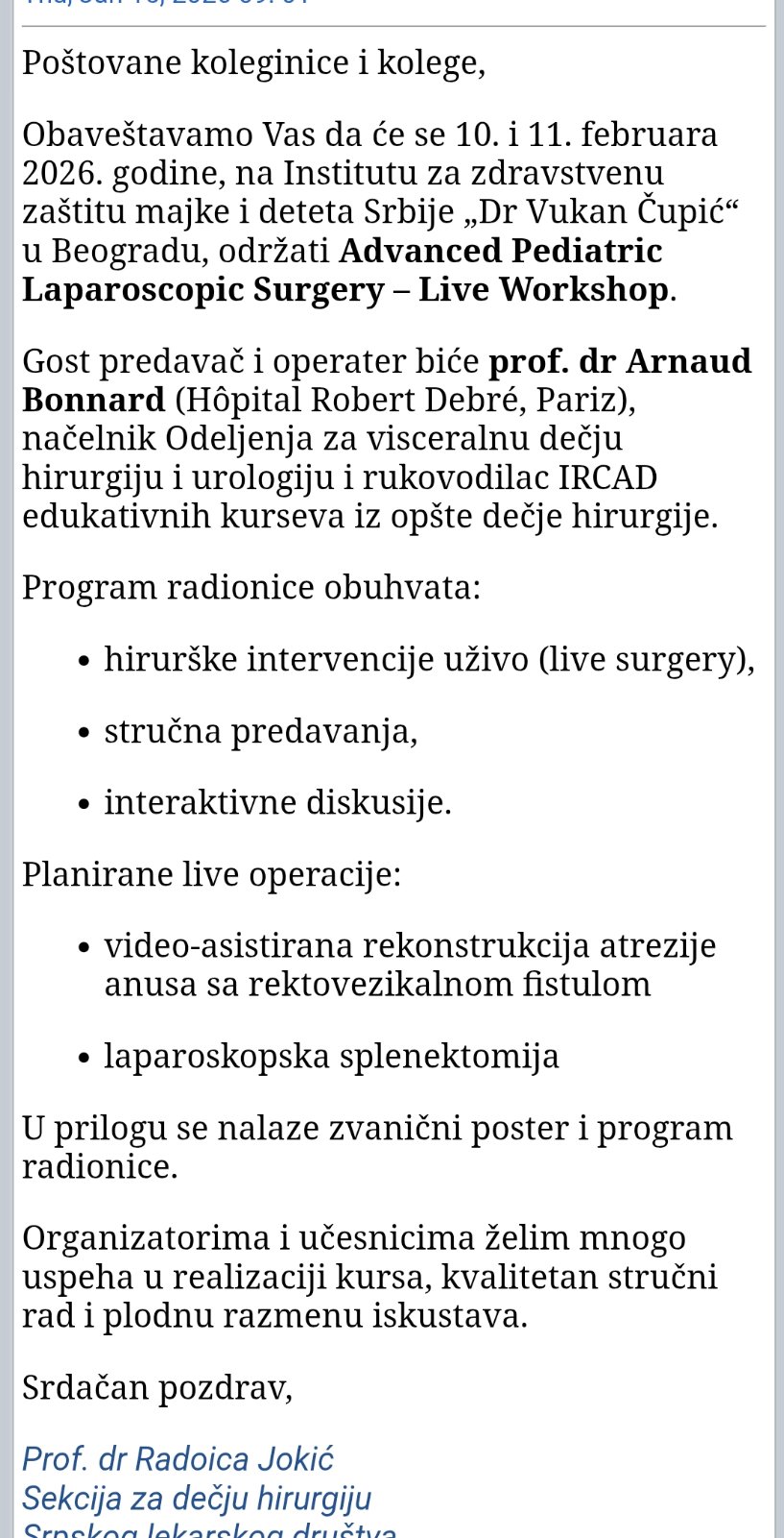 Workshop – Advanced Pediatric Laparoscopic Surgery By admin|2026-01-20T18:19:22+01:0020 siječnja, 2026|Edukacije, Novosti|Komentari isključeni za Workshop – Advanced Pediatric Laparoscopic Surgery Share This Story, Choose Your Platform! FacebookXRedditLinkedInWhatsAppTumblrPinterestVkEmail: About the Author: admin Prikaži povezane objave Preporuke WHO u vezi korona virusa COVID-2019 Gallery Preporuke WHO u vezi korona virusa COVID-2019 Prof.dr Samir Delibegović član Edukacionog komiteta EAES-a Gallery Prof.dr Samir Delibegović član Edukacionog komiteta EAES-a Članovi AESBH na II Kongresu endoskopskih hirurga Srbije Gallery Članovi AESBH na II Kongresu endoskopskih hirurga Srbije Hands on Course for Neonatal Minimal Invasive Training Gallery Hands on Course for Neonatal Minimal Invasive Training Kongres endoskopskih hirurga na visokom nivou Gallery Kongres endoskopskih hirurga na visokom nivou